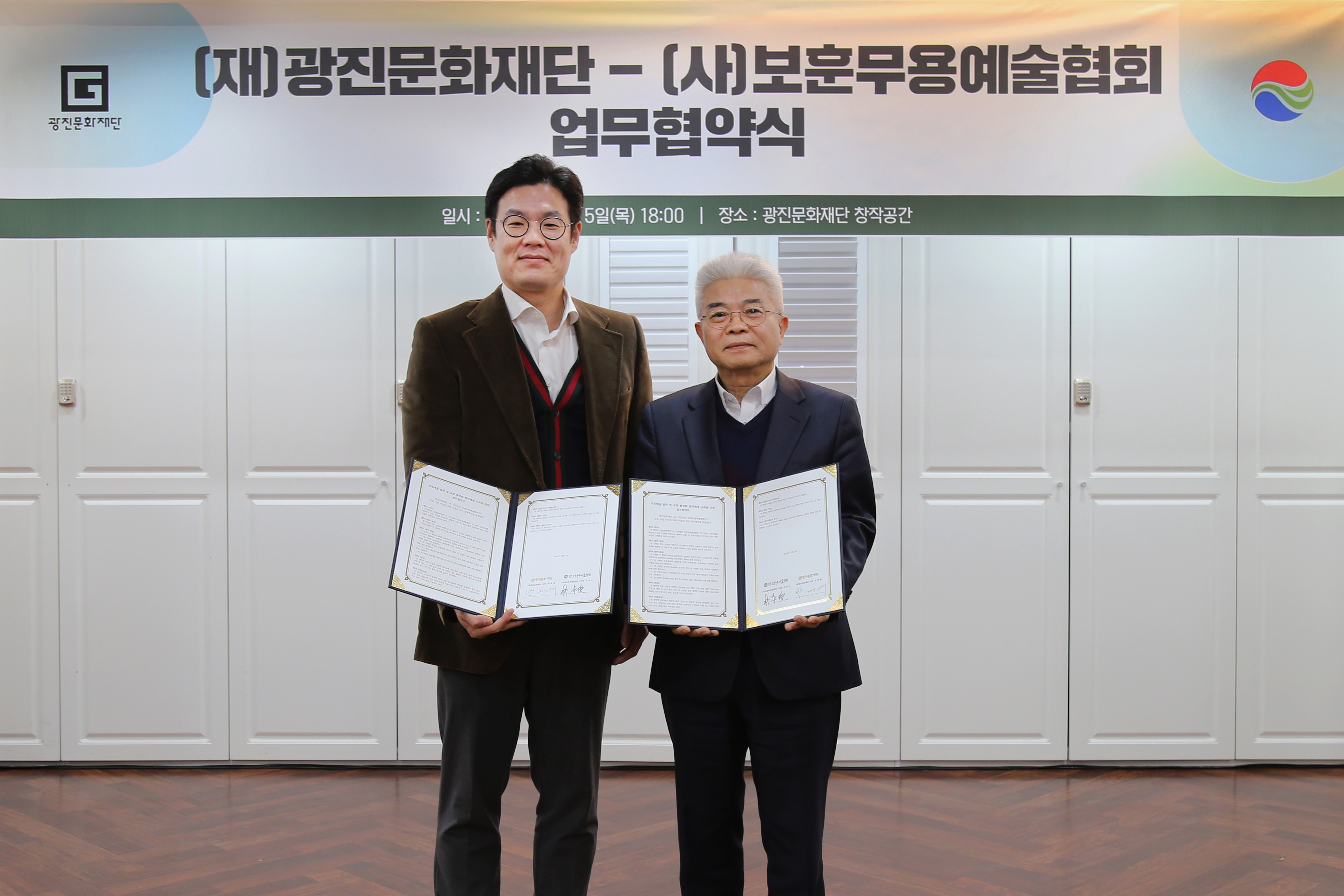 [플레이뉴스 문성식기자] (재) 광진문화재단(이사장 김경호)는 무용예술 발전 및 교류 활성화 협력체계 구축을 위한 (사) 보훈무용예술협회와의 공동 사업 추진을 위해 지난 12월 5일(목) 광진문화재단 창작공간에서 업무협약식을 가졌다.
