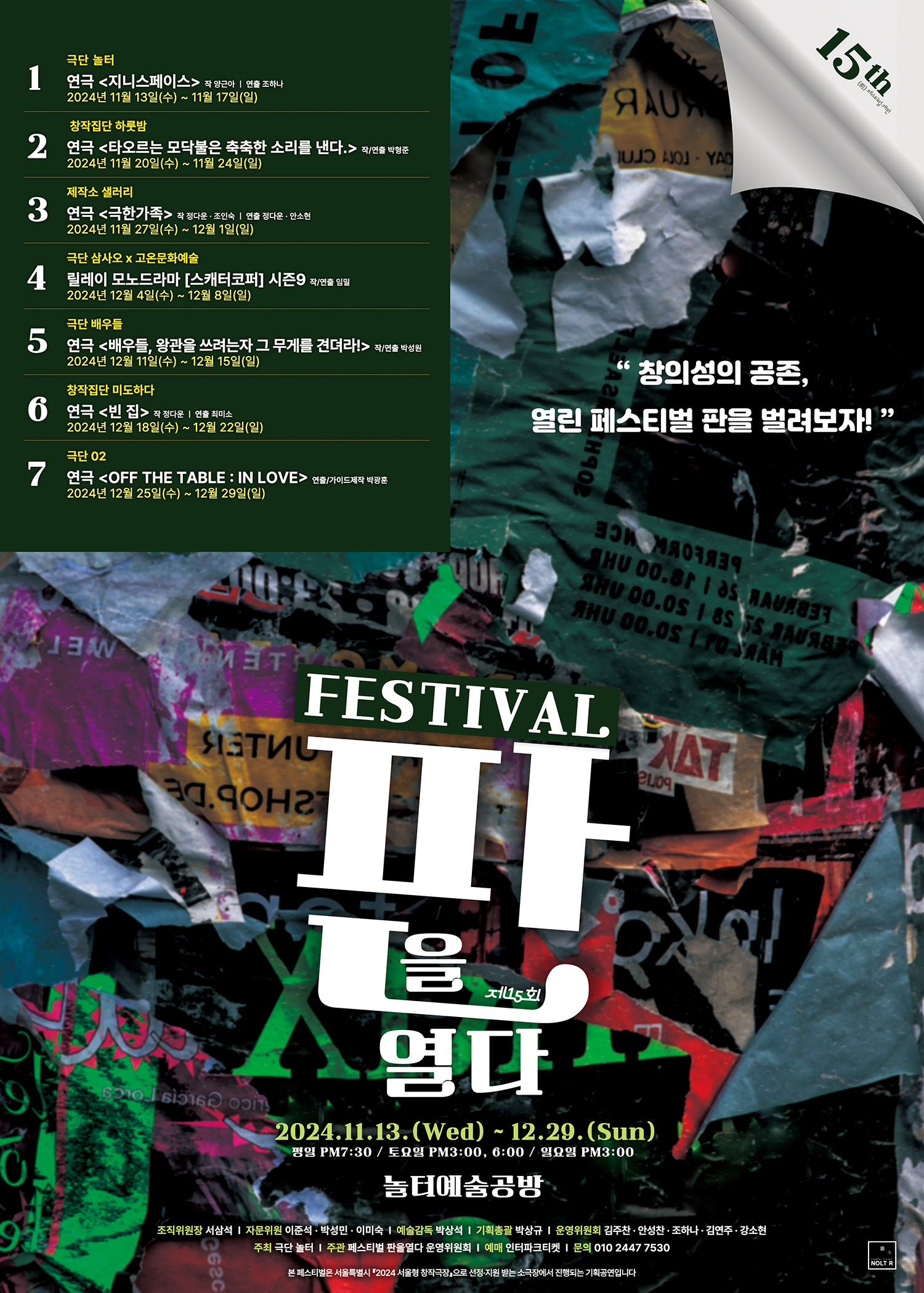 다양하고 독창적인 작품들이 모인 제 15회 페스티벌 “판을 열다”는 7주간 총 7 단체의 공연이 릴레이로 이어지며 오는 12월 29일까지 성북구에 위치한 놀터예술공방에서 진행된다.