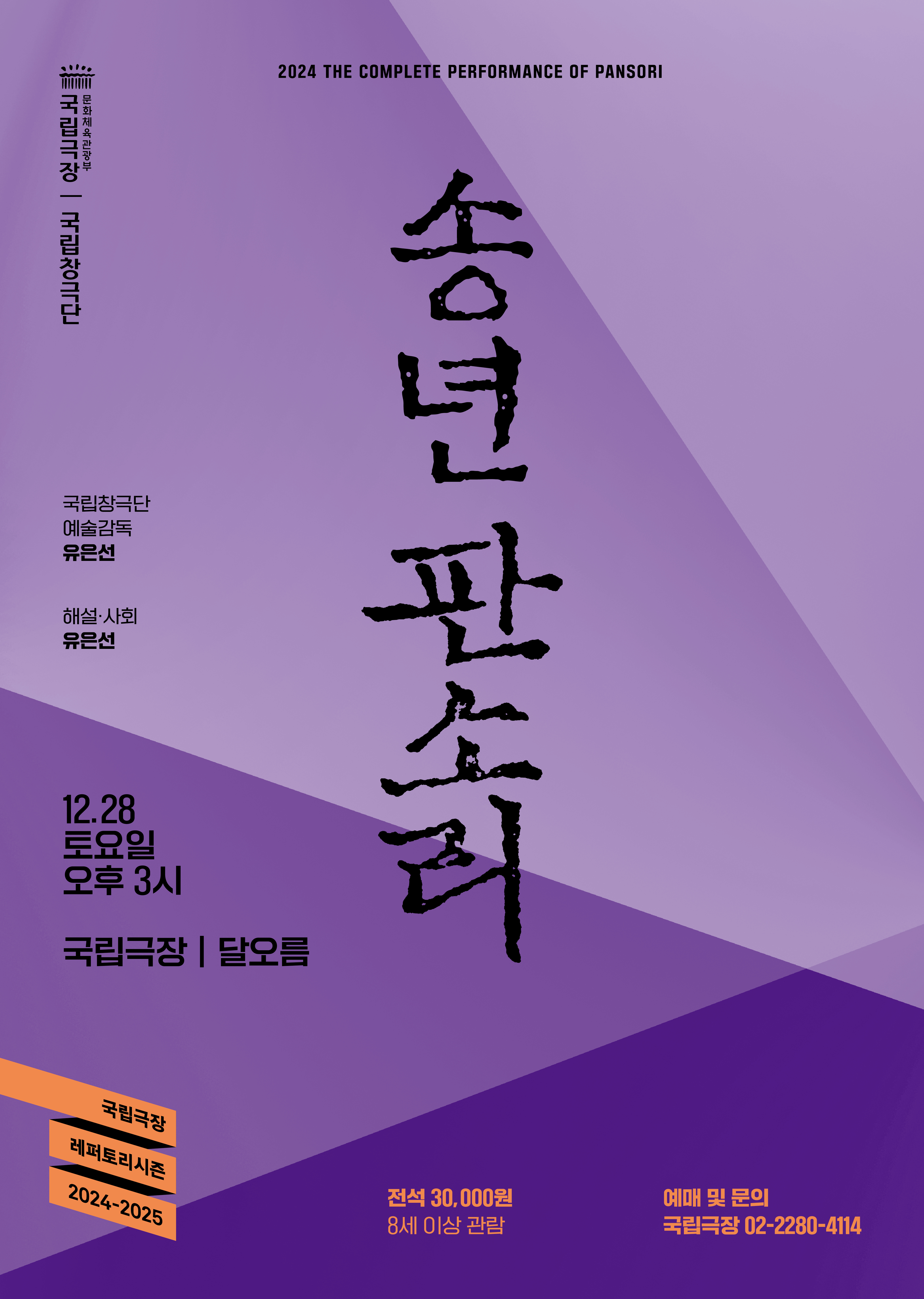 [플레이뉴스 문성식기자] 국립창극단(유은선 예술감독 겸 단장)은 2024년 국립극장 완창판소리 마지막 무대로 2024 국립극장 '송년판소리'를 12월 28일(토) 달오름극장에서 공연한다.
