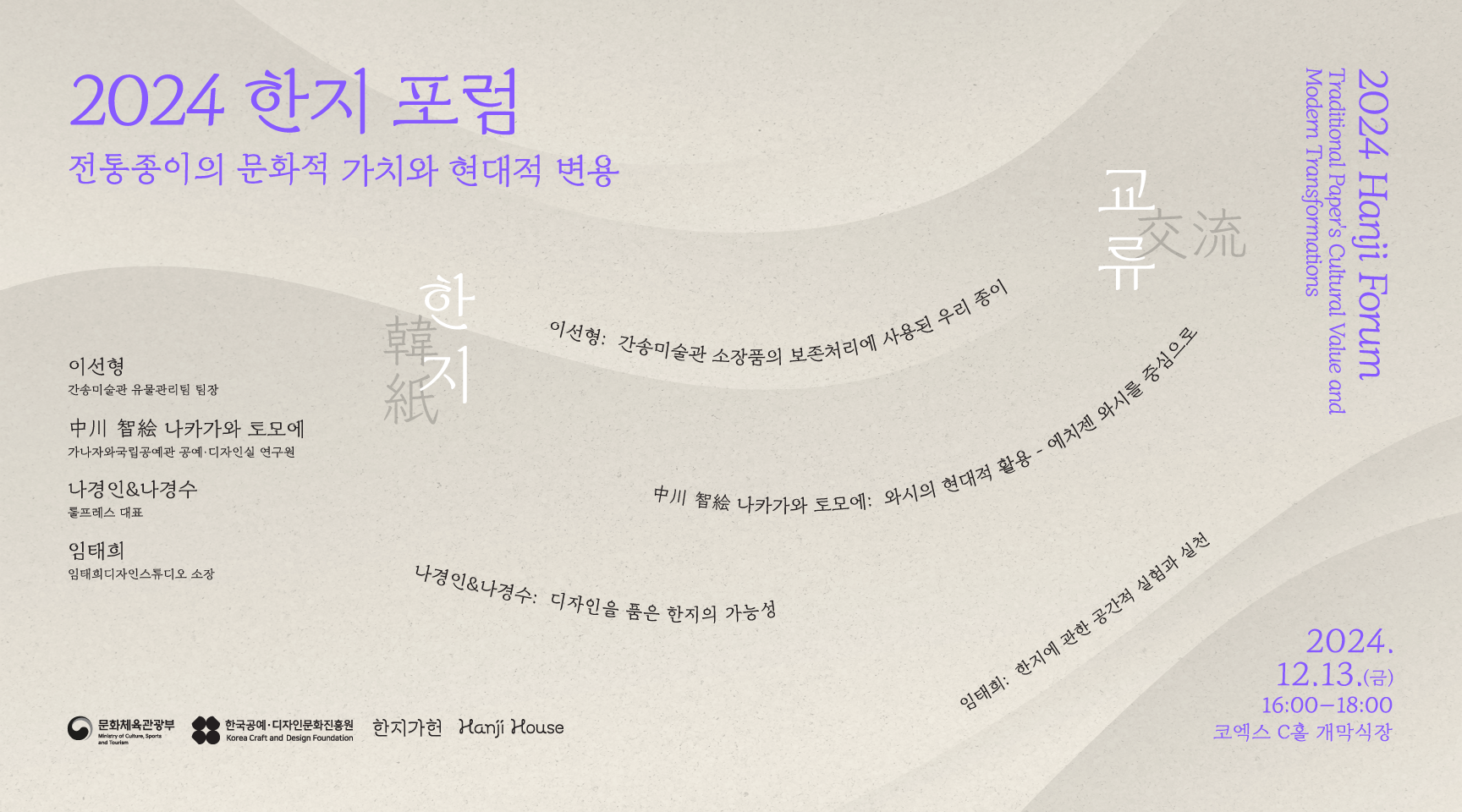 이번 〈한지포럼〉은 ‘전통종이의 문화적 가치와 현대적 변용’을 주제로, 한지의 보존·복원, 건축, 디자인·문화상품 분야에서의 우수성과 재료적 확장성을 논의하는 장이 될 예정이다.