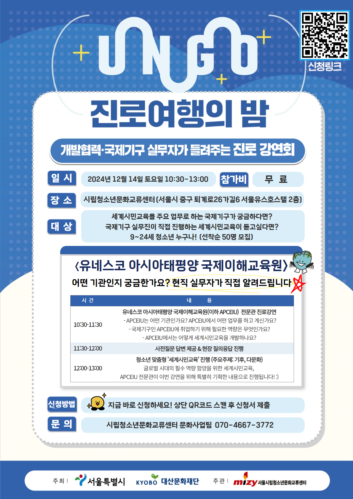 오는 12월 14일에는 유네스코 아시아태평양 국제이해교육원(APCEIU) 실무자가 참석해 기관소개 및 진로특강, 그리고 이번 강연회를 위해 특별히 기획된 글로벌 시대의 필수 역량 함양을 위한 청소년 맞춤형 세계시민교육을 진행한다.
