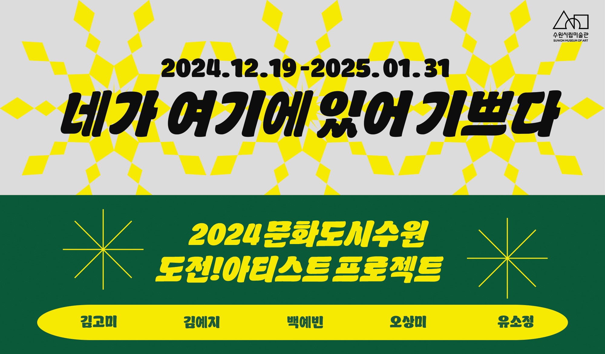 [플레이뉴스 문성식기자] 경기도 수원시 수원시립미술관(관장 홍건표)은 「2024 문화도시 수원 연계사업」 하반기 프로젝트 '도전! 아티스트'의 결과 전시 《네가 여기에 있어 기쁘다》를 12월 19일(목)부터 행궁동 본관에서 개최한다.