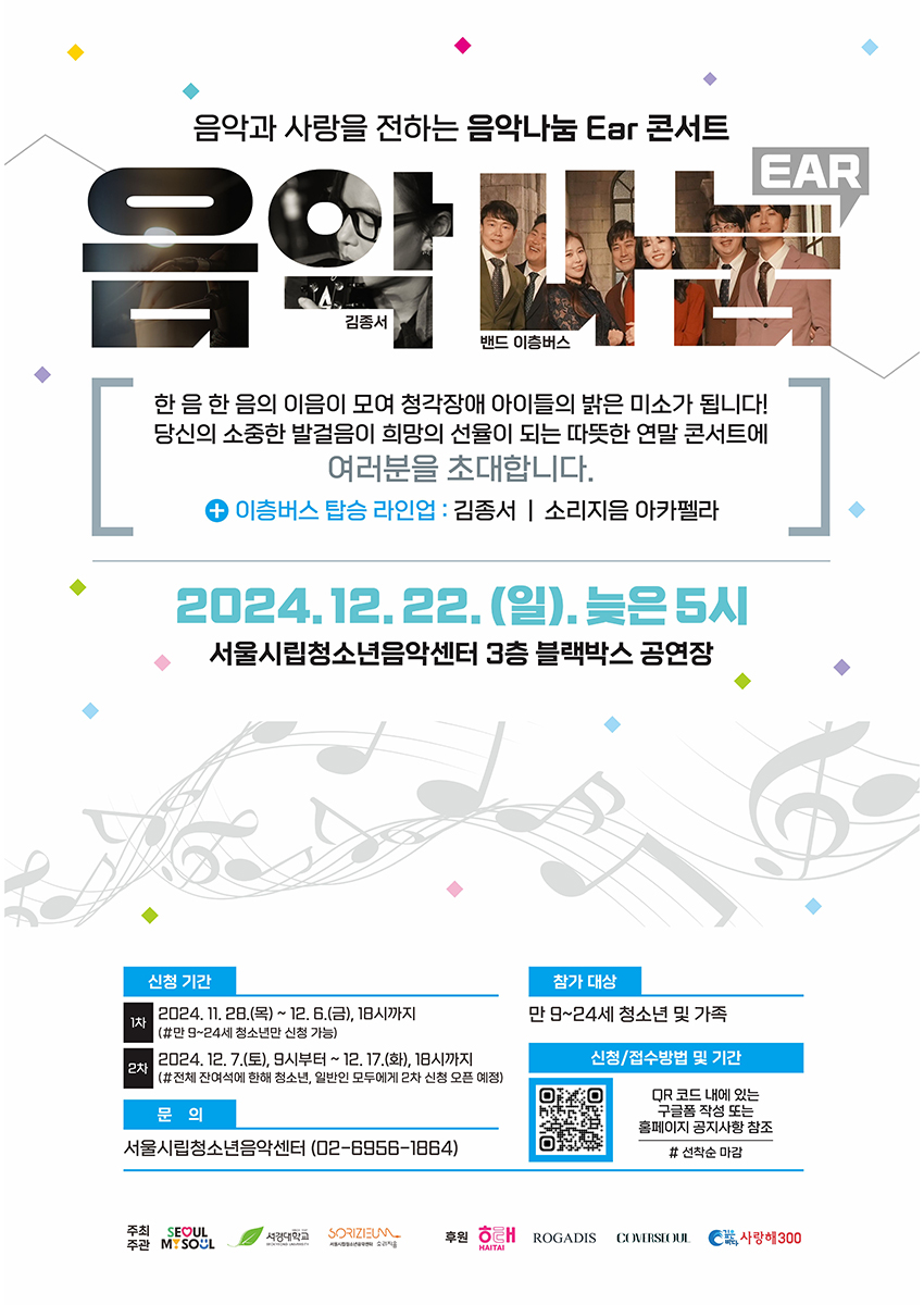 [플레이뉴스 문성식기자] 국내 유일 청소년 음악 특화시설 서울시립청소년음악센터(센터장 심해빈)가 청각장애 아동의 수술비 마련을 위한 2024년 음악나눔 ‘ear (이어)’ 라이브 콘서트를 오는 22일 서울시립청소년음악센터 3층 블랙박스 공연장에서 진행한다.