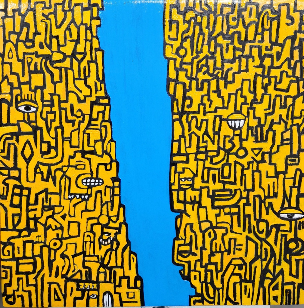작품명 '한강'은 그림의 중심에 유유히 흐르는 강줄기를 따라 펼쳐진 많은 사람들의 인생이야기를 밝고 경쾌한 색상으로 즐겁게 표현하였다.