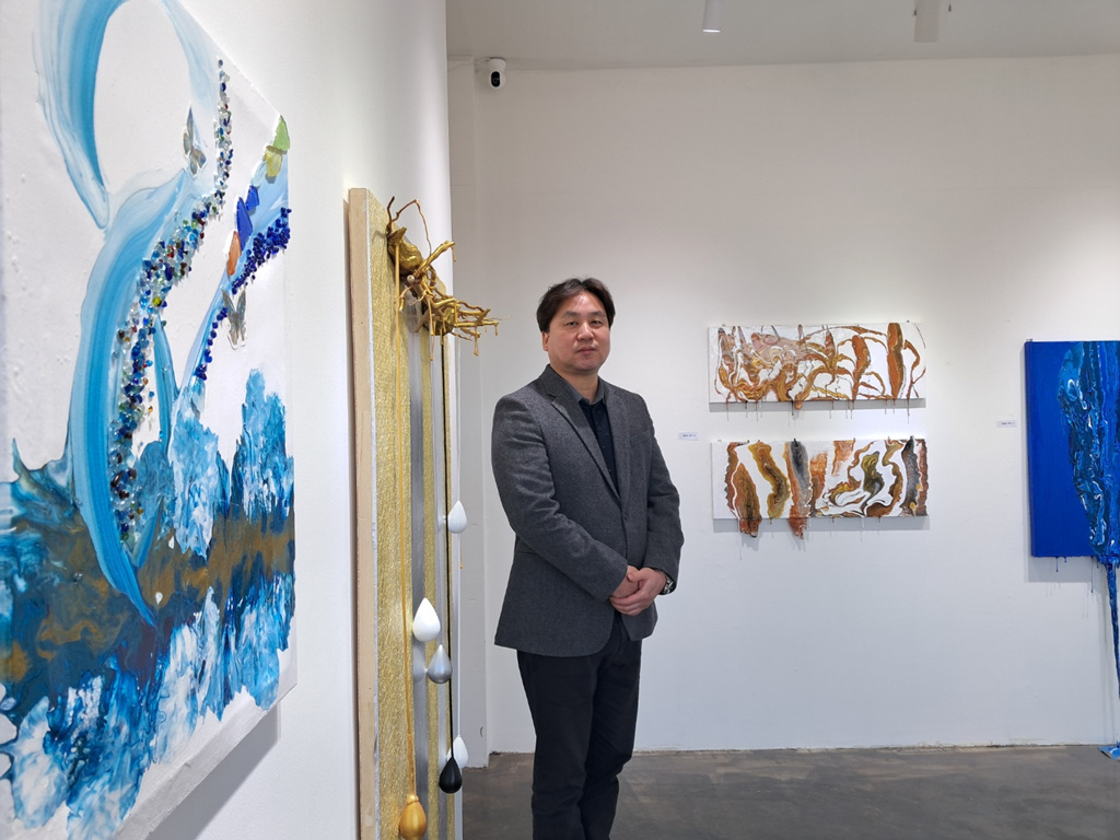 "2024 흐름" 초대 개인전을 진행 중인 김영규 작가는 "재료의 특성과 성질에 관심이 많아 작품 표현을 위한 다양한 재료에 대한 실험과 표현을 기반으로 작업하고 있다.