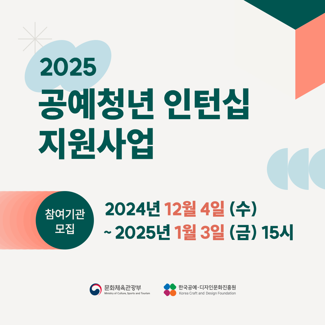 [플레이뉴스 문성식기자]화체육관광부(장관 유인촌, 이하 문체부)와 한국공예‧디자인문화진흥원 (원장 장동광, 이하 공진원)이 2025년 「공예청년인턴십 지원」사업 참여기관을 모집하고 있다.