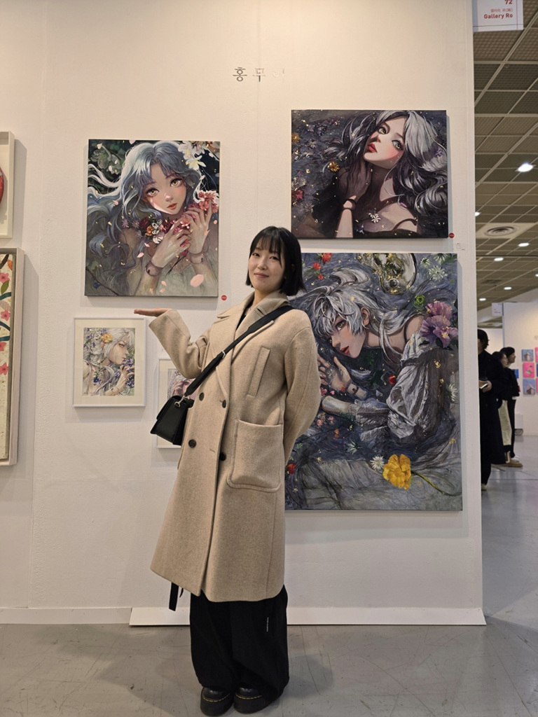 ‘2024 서울아트쇼’ 완판 작가로 존재감을 알린 홍무아 작가는 "눈을 뜨고 눈을 감고 걸음을 옮기는 곳마다 인형이 늘어서 있었으며, 하루의 시작과 끝을 모두 그것과 함께 했다.