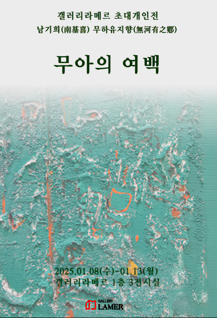 [플레이뉴스 문성식기자] 중국의 사상가 장자(莊子)가 추구한 무위자연(無爲自然)의 이상향을 뜻하는 무하유지향(無何有之鄕)을 추상적 이미지 구축하여 예술로 승화시키는 서양화가 남기희 작가는 2025년 1월 8일(수) ~ 1월 13일(월)까지 서울 갤러리라메르 3전시실에서 "무아의 여백" 타이틀로 초대개인전을 실시한다.
