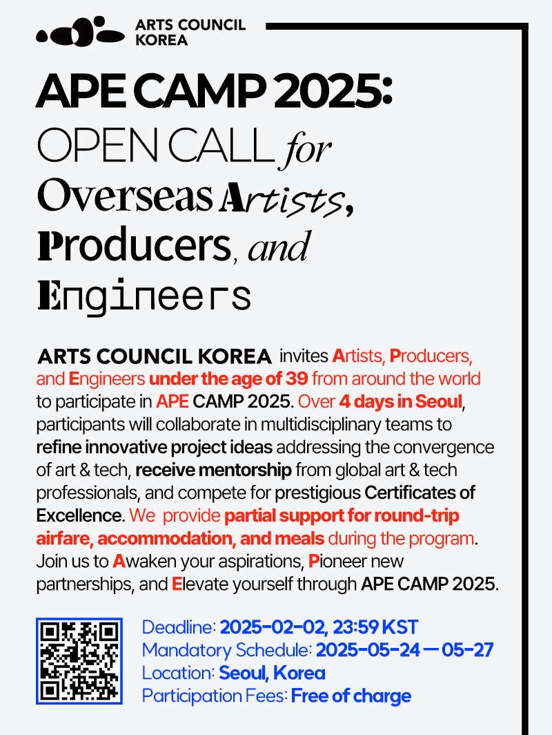 예술위 관계자는 “4회차를 맞아 한 단계 더 도약한 2025년도 에이프캠프에 세계 예술-기술 융복합 무대에서 활동하는 창의인재들이 모여 서로 교류하고 창조적인 아이디어들을 발전시켜 나가기를 기대하고 있으며 해외에서도 많은 관심과 신청을 기대한다”고 말했다.