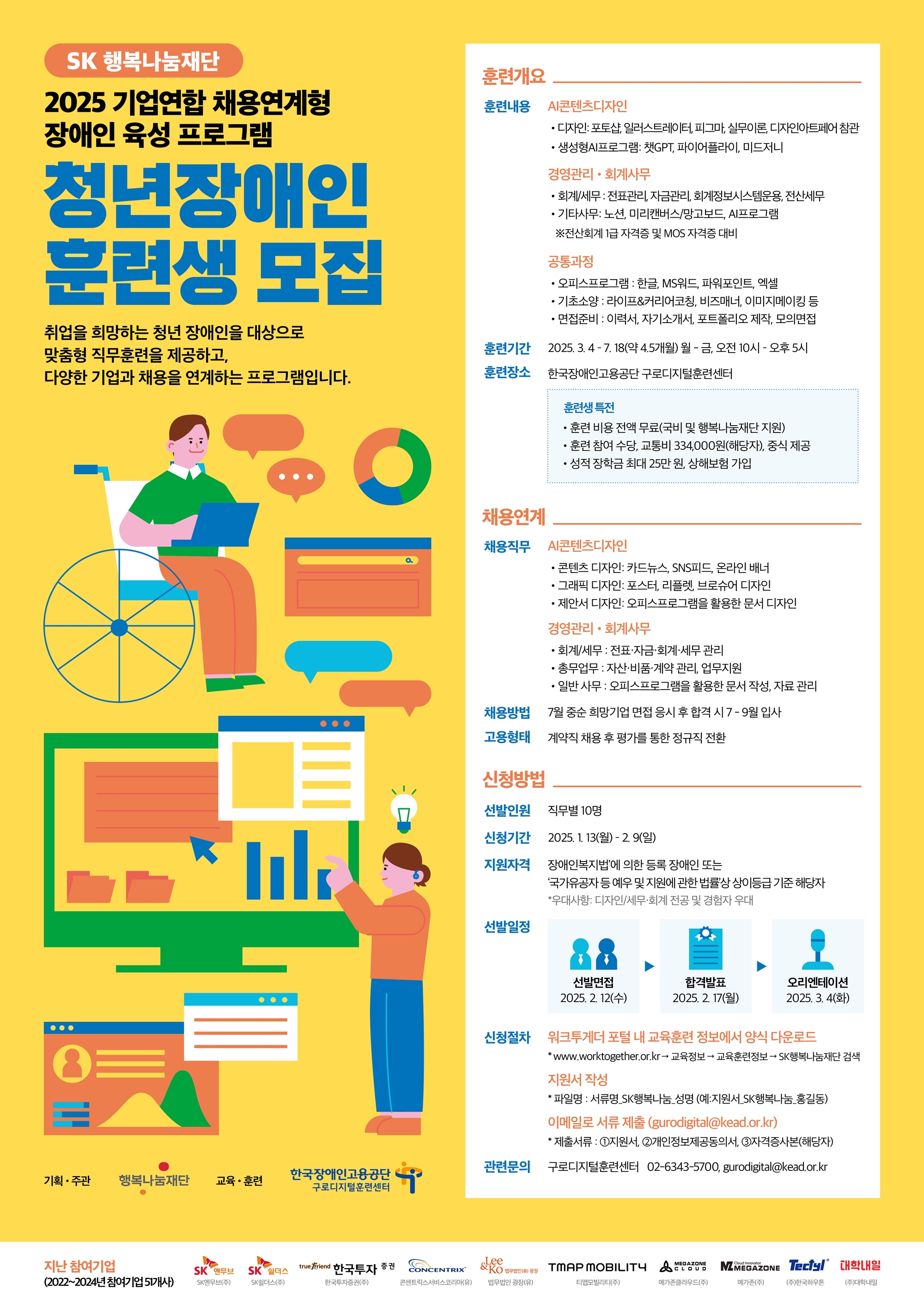 프로그램 참여는 한국장애인고용공단 워크투게더 포털을 통해 신청할 수 있다. 포털 내 ‘교육훈련정보’에서 SK행복나눔재단을 검색한 후 지원 양식을 작성해 이메일로 제출하면 된다.