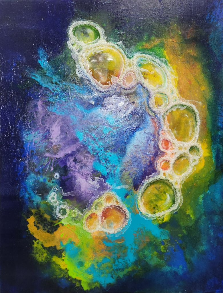 영롱한 물빛의 생기 넘치는 장면을 표현하기 위해 물감과 암염(돌소금)의 융복합적인 조화로움이 작품성을 높인다.