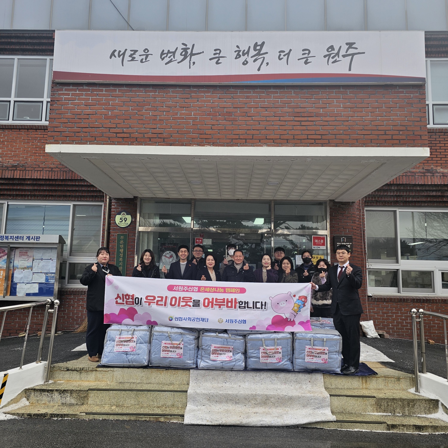 [플레이뉴스 문성식기자] 강원도 원주시에 위치한 서원주신용협동조합(서원주신협)은 한겨울 추위로 고통받을 소외된 이웃들에게 따뜻한 온기를 전하고자 원주시 부론면 행정복지센터를 찾아 겨울이불 32채를 전달하며 따뜻한 겨울나기를 위한 나눔에 온기를 보탰다고 20일 밝혔다.
