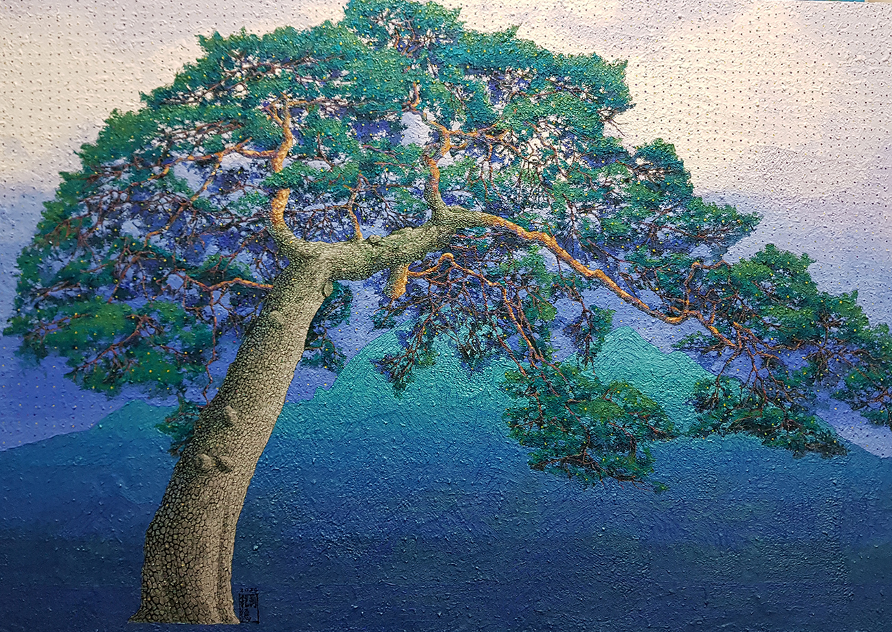 하판덕 선생님의 작업 세계는 불변하는 가치를 탐구하는 이미지를 담고 있으며 작품은 소나무와 뒷배경의 강렬한 색감과 조형미를 통해, 우리에게 인간 존재의 본질을 묻는다.