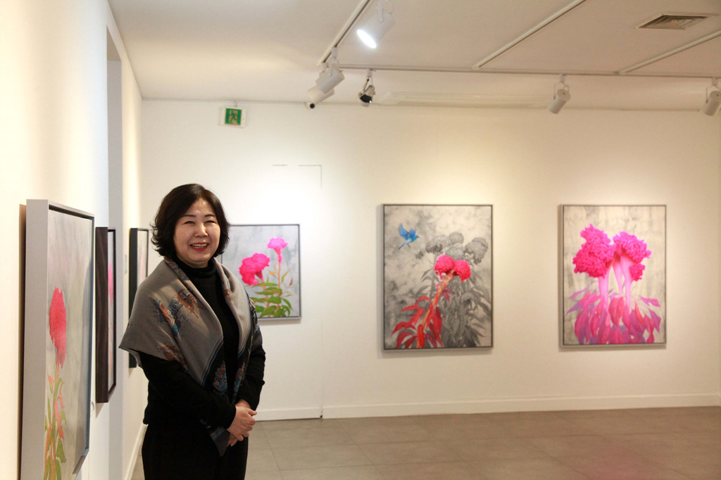 '시들지 않은 사랑' 작품으로 개인전을 실시 중인 유명혜 작가는 "한 작품을 완성하려면 물감을 최소한 열 번 이상 덧입히는 긴 과정을 거쳐야 작품에 깊이도 생기고 원하는 색을 얻을 수 있다.