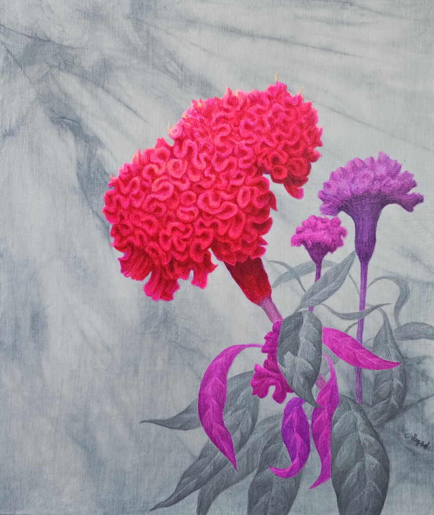 꽃의 강렬한 색 표현으로 위축되고 침체되어 있는 열정을 일으키고, 미래에 대한 불안과 복잡하게 얽혀있는 현실 속에서도 주체로서 의연하게 우뚝 서서 밝고 긍정적인 에너지를 불러와 열정의 삶을 살아가고자하는 소망을 작품에 담는다.