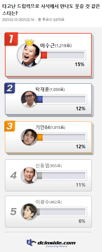커뮤니티 포털사이트 디시인사이드(대표 김유식)가 `타고난 드립력으로 사석에서 만나도 웃길 것 같은 스타는?`으로 투표를 한 결과 이수근이 1위에 올랐다. 이 투표는 지난 10일부터 16일까지 총 7일간 진행했다.