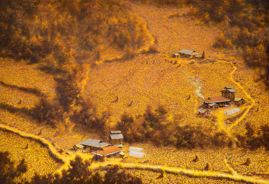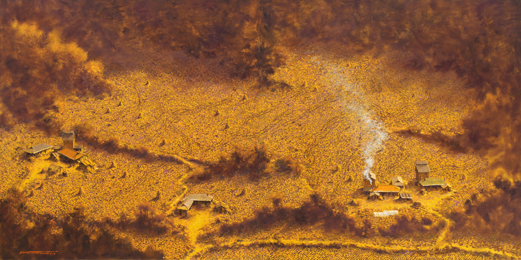 작가 의도와는 상관없이 시선에 이끌려 보이는 모락모락 피어나는 시골집 굴뚝은 온기로 가득한 집안의 풍경이 상상되고, 익은 곡식을 거두어들인 들녘의 모습은 만추(晩秋)의 고즈넉한 매력으로 다가온다.
