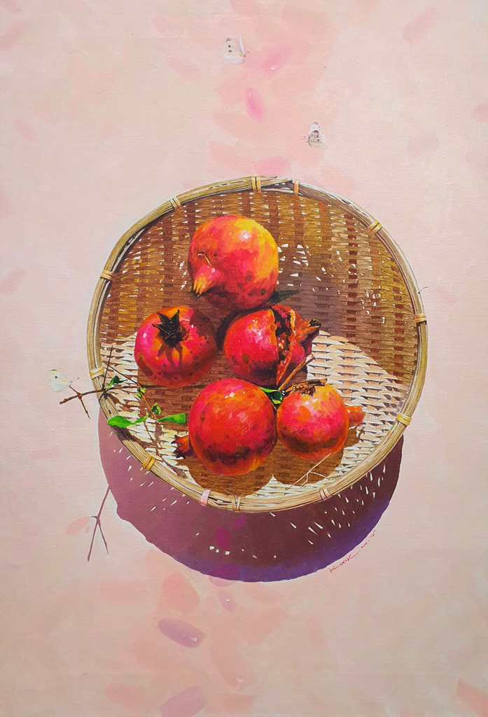 작품명 '석류 이야기'로 풍요를 전하는 국홍주 작가의 그림은 씨앗이 드러날 정도로 잘 익은 모습으로 구성하여 다산과 다복을 상징하는 정체성을 확실하게 구현했다.