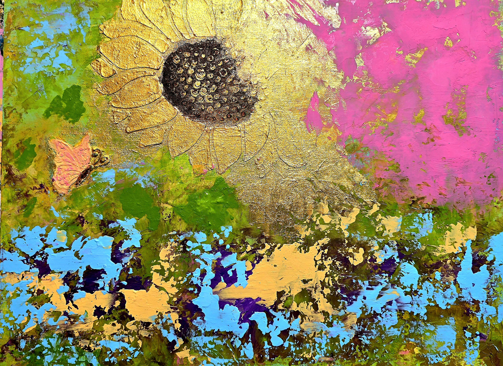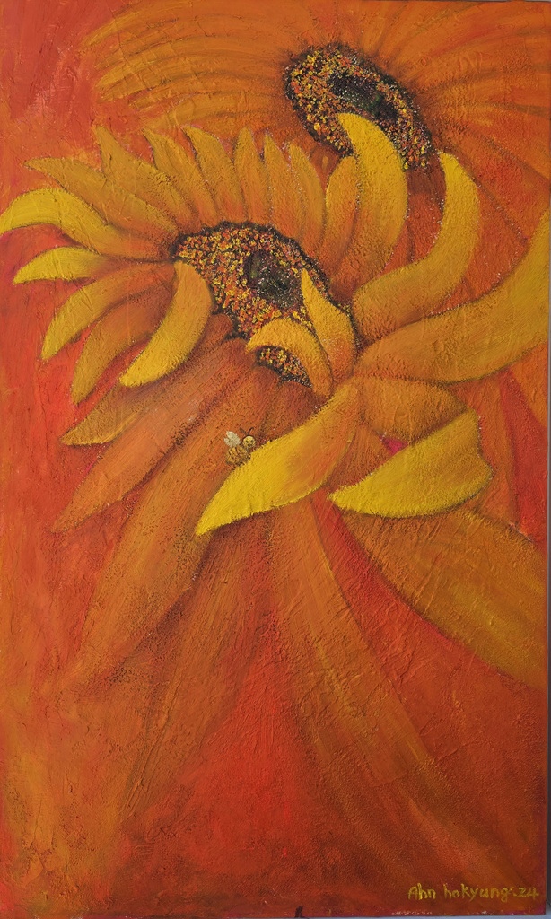특히 해바라기를 구상과 반구상 기법 동시에 구사하며 제작된 그림이 화법에 따라 느끼는 감동이 새로우며, 금빛으로 채색된 꽃잎에 시선을 빼앗기다 보면 마음의 기쁨이 스며들듯 찾아온다.