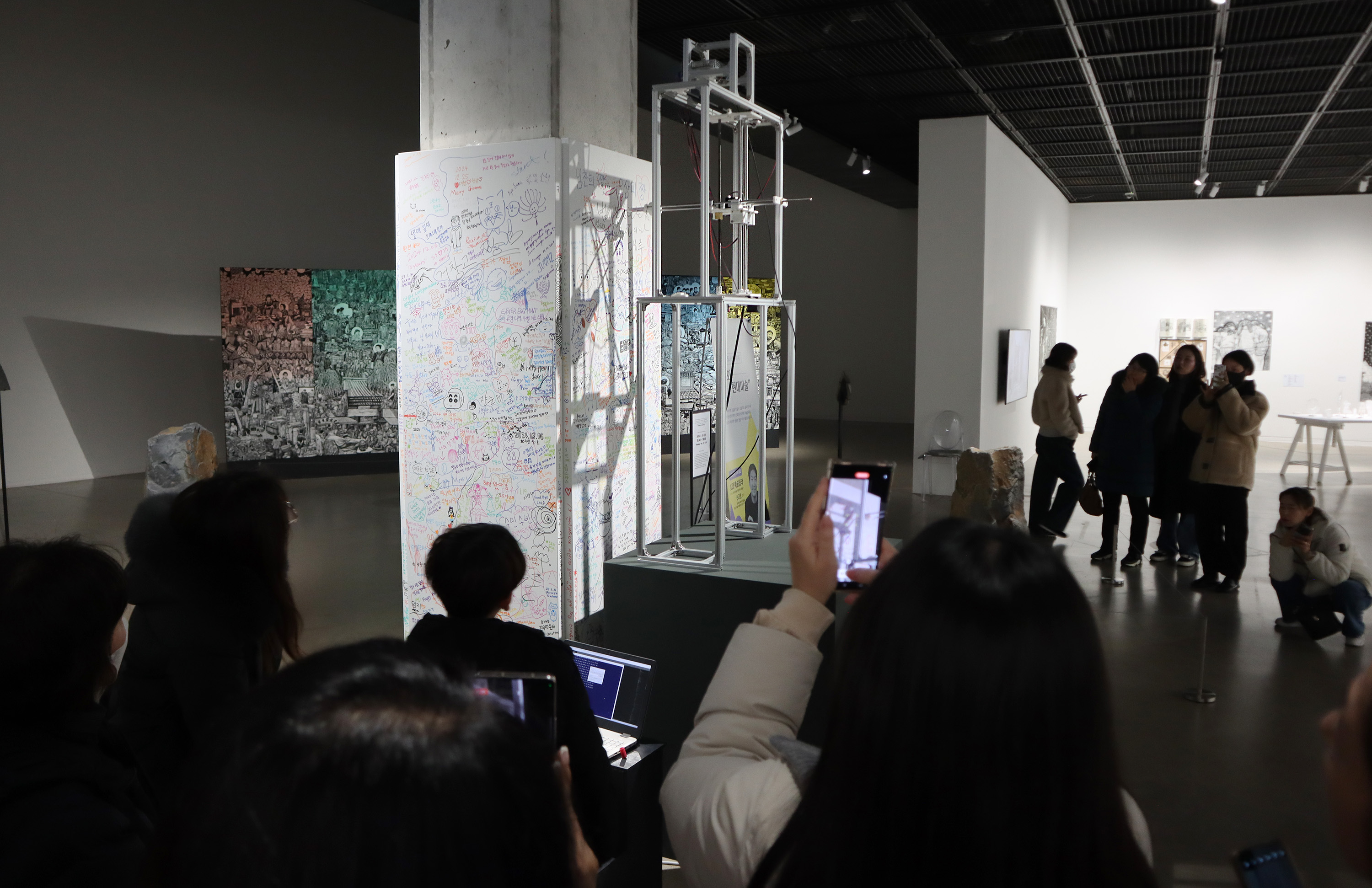 ◯ 참여작가 신교명의 AI 관련 작품 '두들러'에 대한 소개와 현재 AI와 미술의 관계 강연 후 전시장에서 드로잉 퍼포먼스 진행