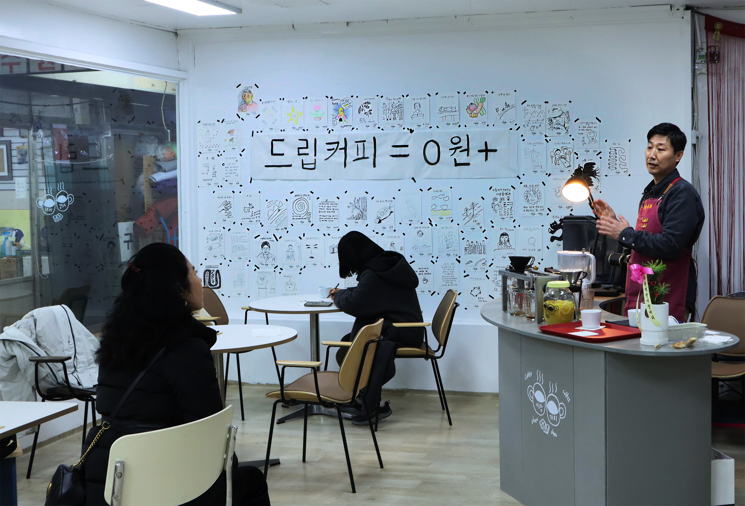 ◯ 천근성 작가의 '시장 커피'는 돈 대신 그림・시 등 방문객의 창작물과 음료를 교환하는 프로젝트로 수원역전시장에서 3월 27일(목)까지 운영