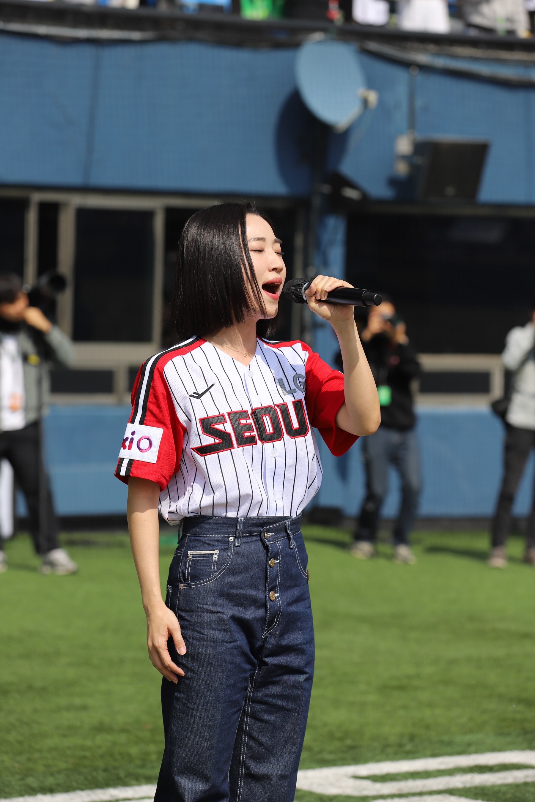 무엇보다 뮤지컬 명배우답게 쭉 뻗어나가는 음색에 파워풀한 창법으로 잠실구장 곳곳에 애국가를 진하게 퍼뜨리는 진풍경을 연출해 이목을 집중시켰다.