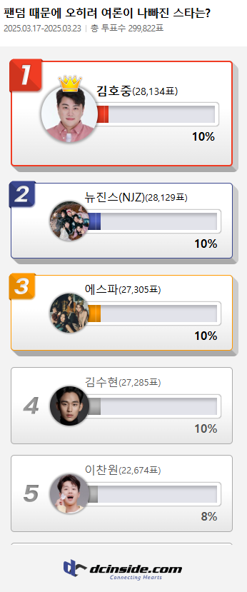 커뮤니티 포털사이트 디시인사이드(대표 김유식)가 `팬덤 때문에 오히려 여론이 나빠진 스타는?`으로 투표를 한 결과 김호중이 1위에 올랐다. 이 투표는 지난 17일부터 23일까지 총 7일간 진행했다.