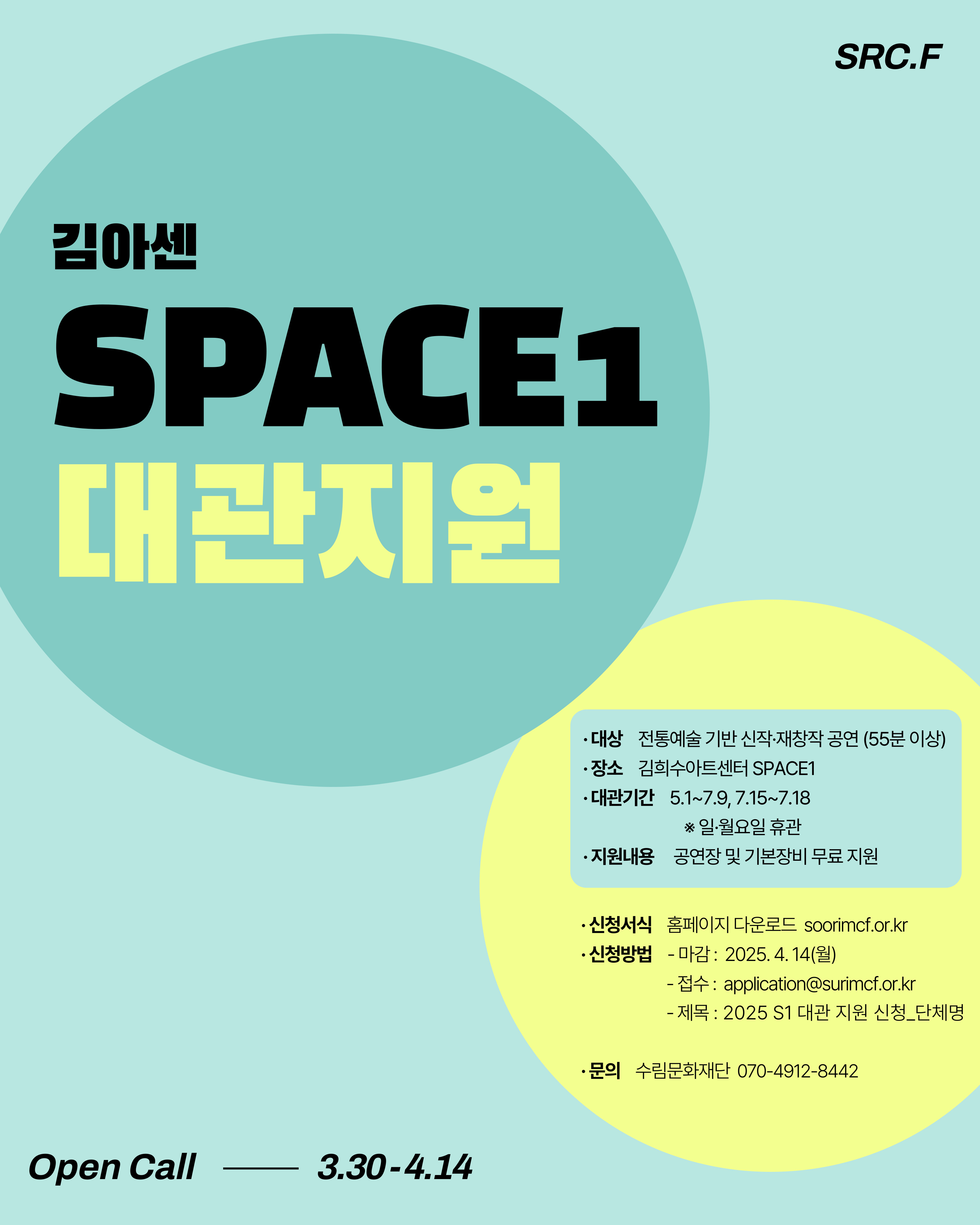 재단 관계자는 “SPACE1은 전통과 현대가 만나는 창의적 공간”이라며 "창작 열정과 실력을 갖춘 예술가들의 많은 관심과 참여를 기대한다"고 밝혔다.