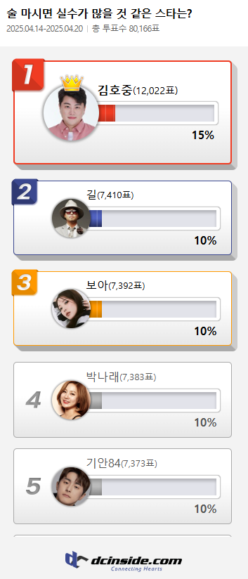 커뮤니티 포털사이트 디시인사이드(대표 김유식)가 `술 마시면 실수가 많을 것 같은 스타는?`으로 투표를 한 결과 김호중이 1위에 올랐다. 이 투표는 지난 14일부터 20일까지 총 7일간 진행했다.