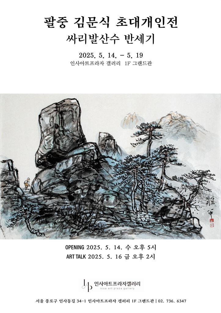 [플레이뉴스 문성식기자] 수묵산수화의 담백하고 청량한 느낌을 제대로 느낄 수 있는 작품으로 팔중 김문식 화백은 오는 2025년 5월 14일(수) ~ 5월 19일(월)까지 '싸리발산수 반세기' 타이틀로 서울 인사아트프라자갤러리 1F 그랜드관에서 초대개인전을 진행 한다.