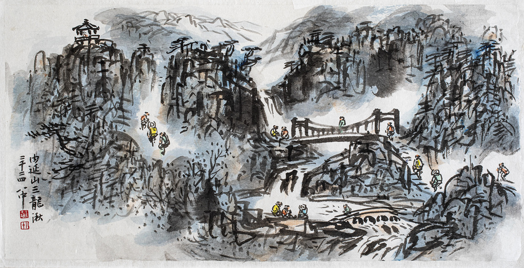 내연산삼용추' 작품은 굵은 선들의 구성 위에 옅은 수묵 채색으로 산세를 웅장하게 제작해 멋진 풍광을 형성하여 자연에 대한 경외심을 갖게 한다.