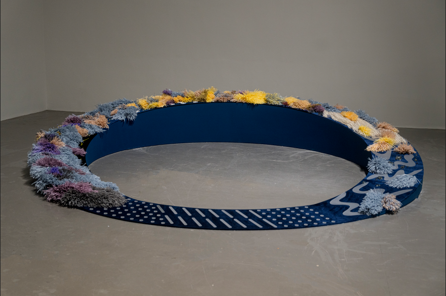 | SEOM, '감각을 따라 걷기', 2025, 천, 실, 아크릴, 사운드 모듈, 스피커, 550×55×75cm, 작가소장, 부산현대미술관 제작 지원 |