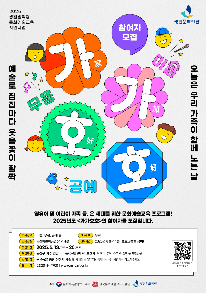 [플레이뉴스 문성식기자] (재)광진문화재단은 문화체육관광부가 주최하고 한국문화예술교육진흥원이 주관하는 ‘2025 생활밀착형 문화예술교육 지원사업 가가호호(家加好好) 운영기관 공모’에 선정되어 2025년 6월부터 11월까지 광진구민을 대상으로 다양한 장르의 무료 예술교육프로그램을 추진한다.