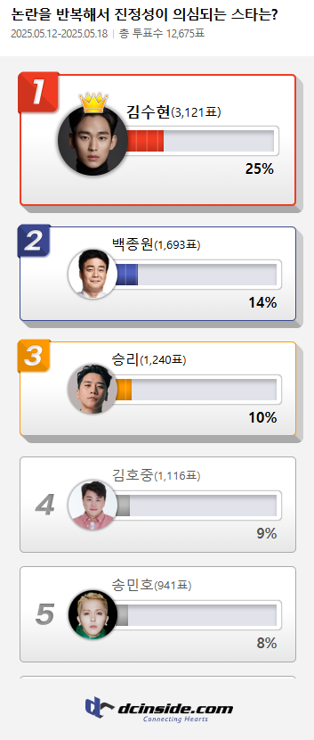 커뮤니티 포털사이트 디시인사이드(대표 김유식)가 `논란을 반복해서 진정성이 의심되는 스타는?`으로 투표를 한 결과 김수현이 1위에 올랐다. 이 투표는 지난 12일부터 18일까지 총 7일간 진행했다.
