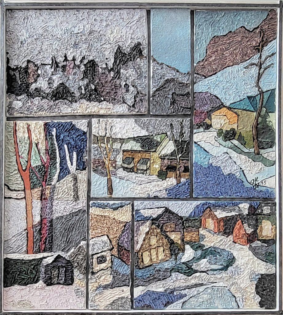 작품명 "눈의 나라(A Snow Land)"는 캐나다 마을 풍경들을 모자이크화 시켜 특색 있게 제작한 작품이며, 한 그림 속에 여러 풍경들 담고자 프레임을 한 번 더 쒸웠다.