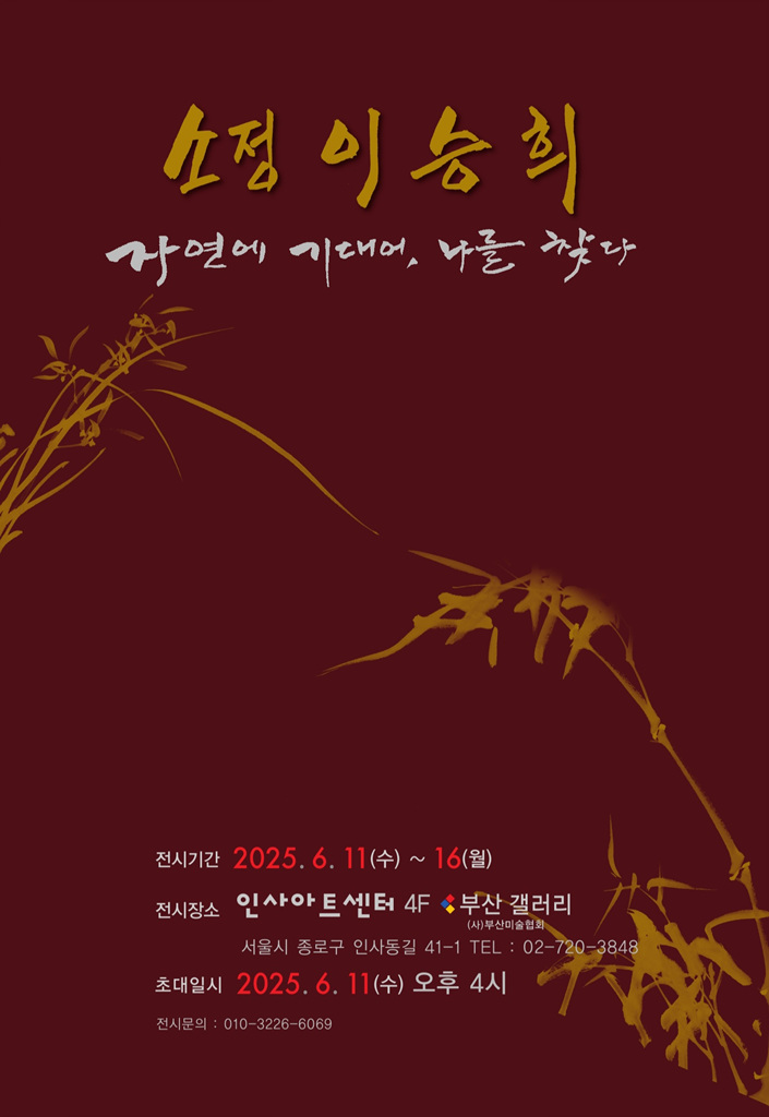 [플레이뉴스 문성식기자] 30여 년간 전통 수묵과 문인화를 기반으로 하는 작품세계를 펼치고, 문인화의 정신세계에서 높은 기상과 품격을 중요시하며 예술성 뛰어난 작품을 제작하는 소정 이승희 작가는 오는 2025년 6월 11일(수) ~ 6월 16일(월)까지 서울 인사아트센터 4F 부산갤러리에서 "자연에 기대어, 나를 찾다. 화합(和合)과 경계(警戒)" 개인전을 진행한다.