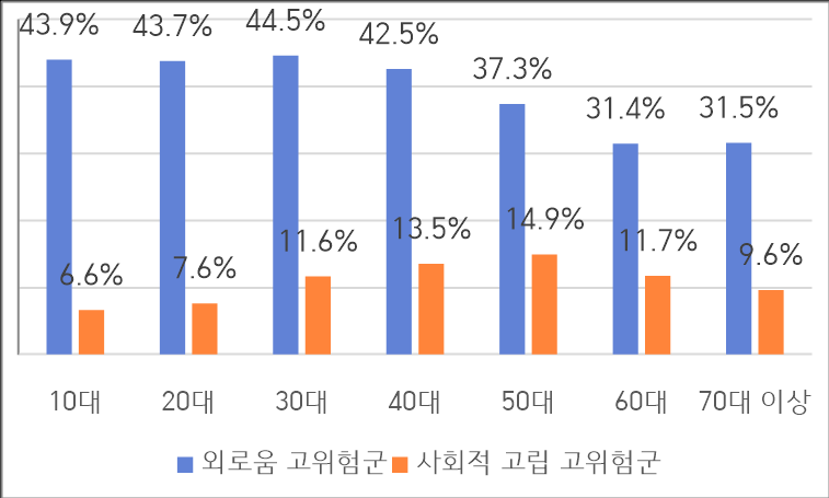 국립정신건강센터가 개발한 ‘외로움과 사회적 고립 척도’를 조사문항에 반영한 결과 응답자인 서울시민 10명 중 4명(39%)이 ‘외로움 고위험군’으로 분류됐고, 10명 중 1명(11.4%)이 ‘사회적 고립 고위험군’에 해당하는 것으로 나타났다. 외로움 고위험군은 젊은 층이 많았고, 사회적 고립은 중장년층이 많았다.