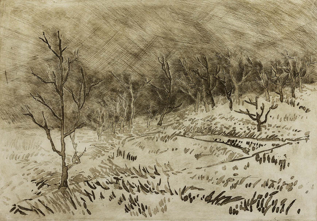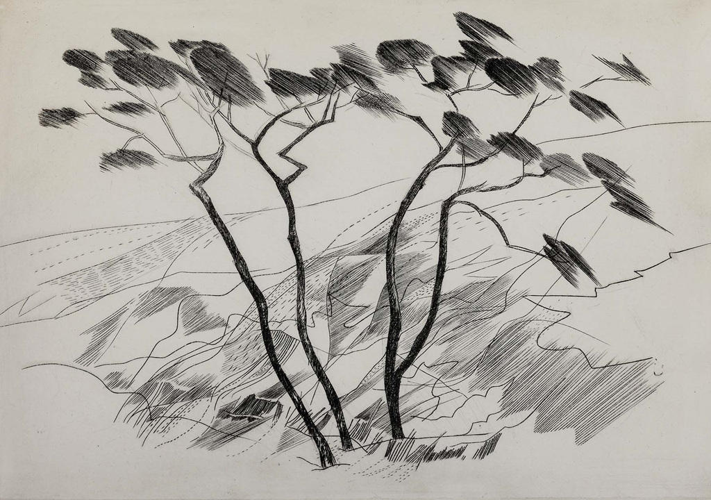 한국화에서 볼 수 있는 우아한 낙락장송 풍경과 소나무 군락은 바람에 흔들리는 솔잎의 느낌까지 묘사하여 판화의 매력을 알렸다.