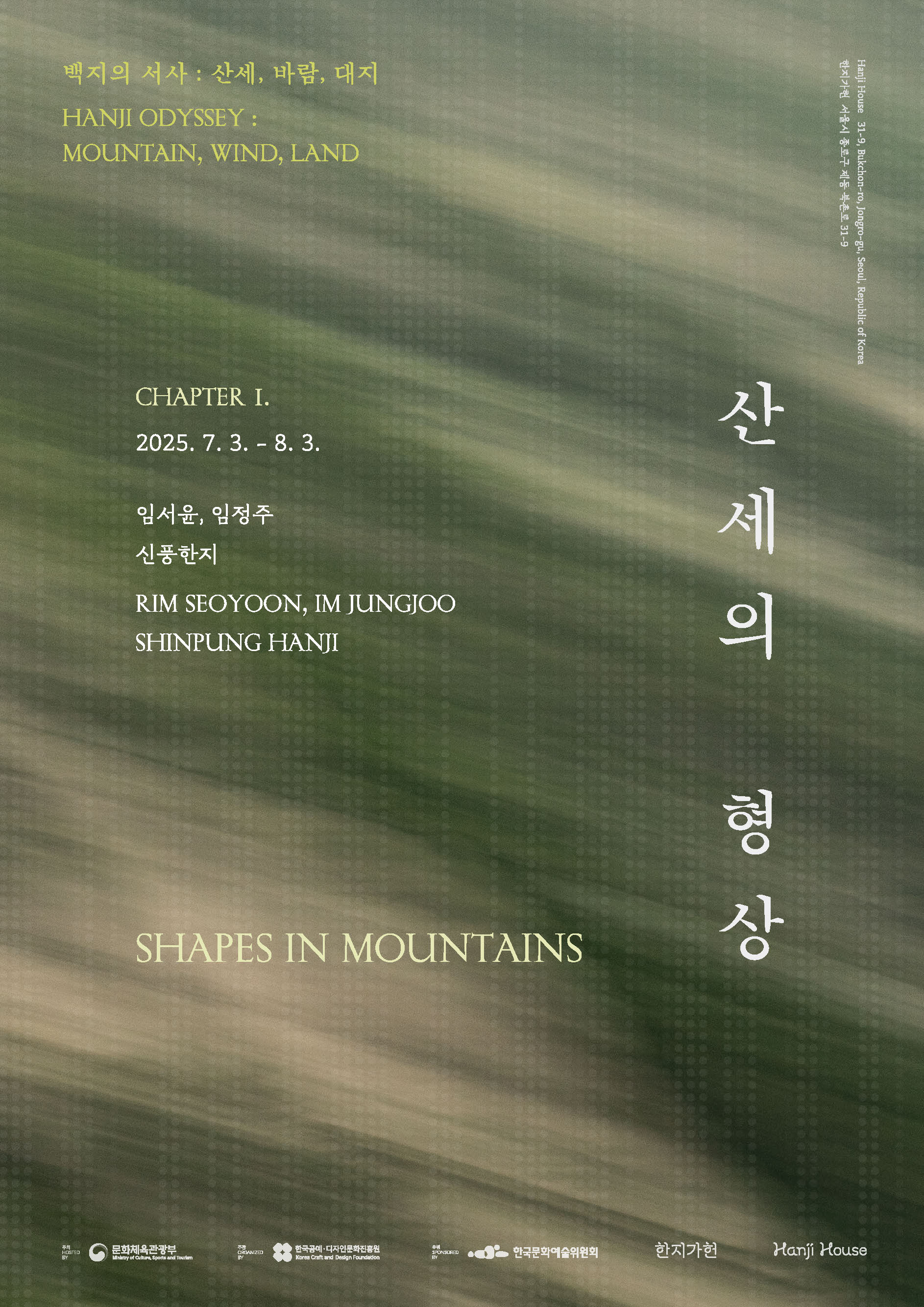 전시는 무료관람이며, 보다 자세한 정보는 공진원 공식누리집www.kcdf.or.kr)에서 확인할 수 있다. 기획전의 첫 시작을 알리는 《산세의 형상(Shapes in Mountains)》은 7월 3일 개막하며, 연계 프로그램 및 참여 신청은 한지가헌 공식 SNS 채널(@hanji.house)을 통해 순차적으로 공개될 예정이다.