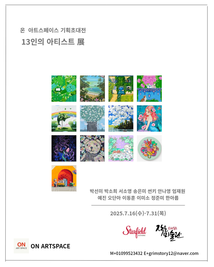 그 일환으로 온 아트스페이스(대표 정윤하)는 2025년 7월 16일(수)부터 7월 31일(목)까지 스타필드 고양 4층 작은미술관에서 ‘13인의 아티스트展’을 기획초대전 형식으로 전시가 진행 중에 있다.