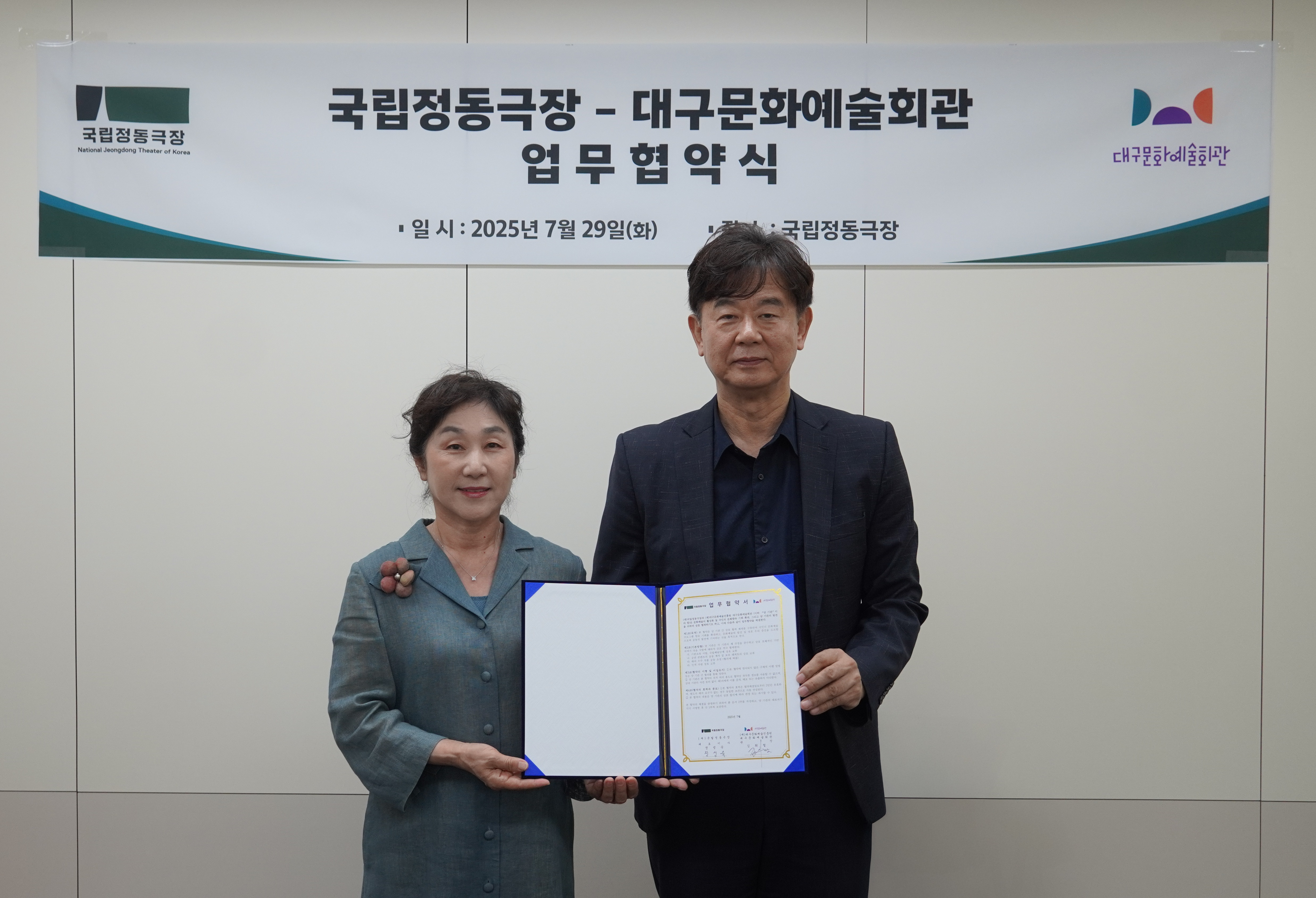 [플레이뉴스 문성식기자] 국립정동극장(정성숙 대표이사)과 대구문화예술진흥원 대구문화예술회관(김희철 관장, 이하 “양 기관”)은 2025년 7월 29일, 문화예술의 활성화와 국민의 문화 향유 기회 확대, 그리고 양 기관의 발전을 위한 상호 협력체계를 구축하고자 업무협약(MOU)을 체결했다.
