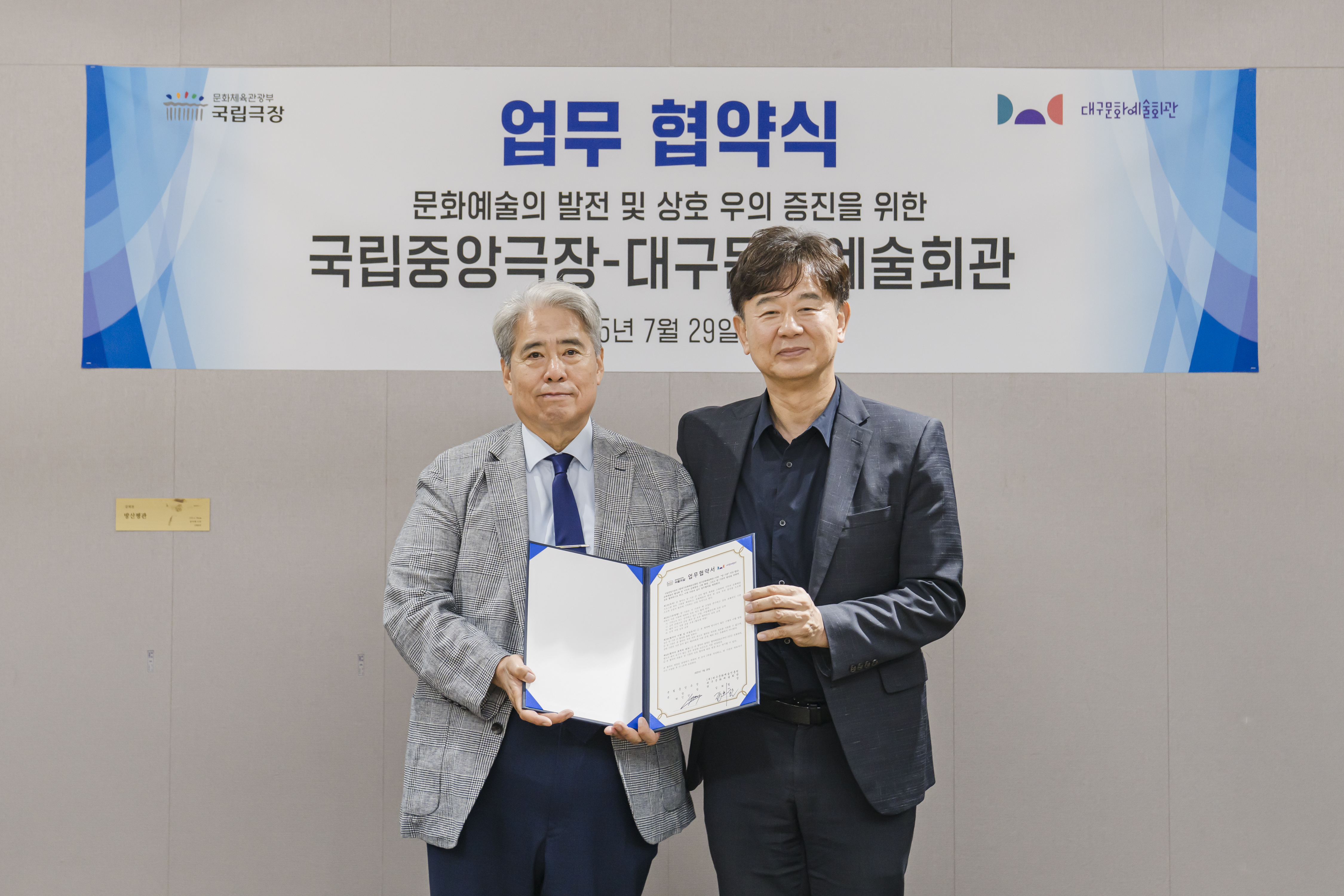 [플레이뉴스 문성식기자] 국립중앙극장(극장장 박인건, 이하 국립극장)()대구문화예술진흥원 대구문화예술회관(관장 김희철, 이하 대구문예회관)729(), 국립극장에서 문화예술 활성화 및 문화향유 기회 확대를 위한 업무협약(MOU)을 체결했다.