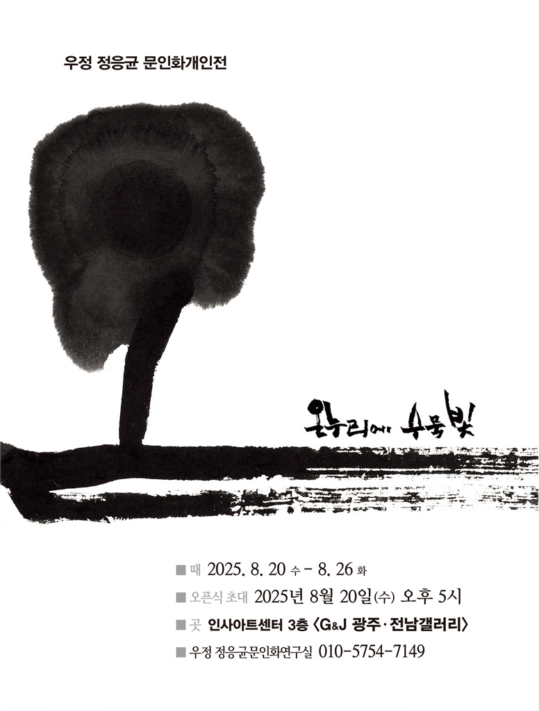 특히 문인화가 우정 정응균 작가는 전통과 현대적 이미지를 조화롭게 구사한 작품으로 오는 2025년 8월 20일(수) ~ 8월 26일(화)까지 서울 인사아트센터 3층 G&J갤러리에서 "온누리에 수묵빛" 타이틀로 개인전을 진행한다.