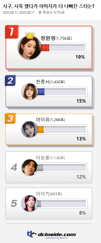 커뮤니티 포털사이트 디시인사이드(대표 김유식)가 `시구, 시축 했다가 이미지가 더 나빠진 스타는?`으로 투표를 한 결과 장원영이 1위에 올랐다. 이 투표는 지난 11일부터 17일까지 총 7일간 진행했다.