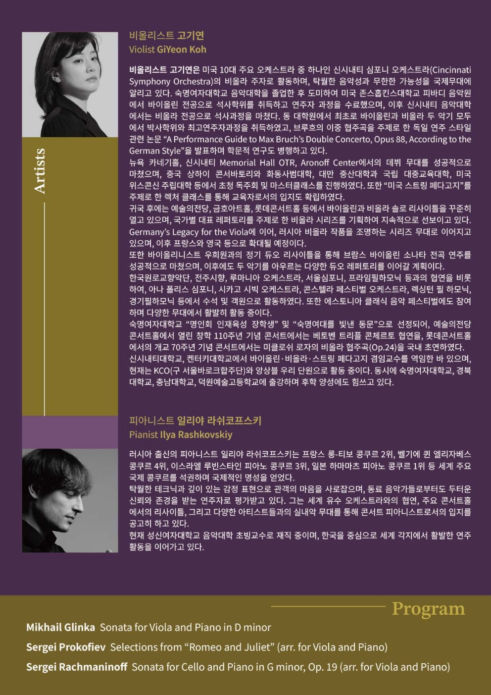 이번 무대에서는 러시아 음악의 아버지로 불리는 미하일 글린카, 풍부한 서사와 색채감을 지닌 세르게이 프로코피예프, 러시아 낭만주의 전통의 마지막 계승자 세르게이 라흐마니노프의 작품이 연주된다. 특히 프로코피예프의 '로미오와 줄리엣' 발췌곡과 라흐마니노프의 '첼로 소나타'는 비올라와 피아노를 위한 편곡으로 선보이며, 비올라 특유의 중후한 음색으로 러시아 음악의 감동을 깊게 전할 예정이다.