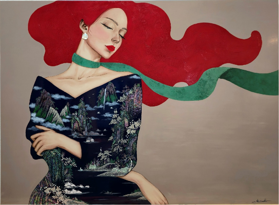 김미숙은 자개와 옻칠을 회화에 도입해, 여성 인물의 표정과 자태를 빛과 결로 형상화한다. 자개의 영롱한 색과 옻칠의 깊은 광택은 전통 공예의 미감을 현대적으로 확장하며, 인물의 내면에 깃든 기품과 강인함을 함께 드러낸다.