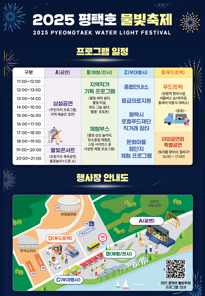 축제의 하이라이트인 물빛콘서트는 이날 오후 7시 A구역에서 열린다. 평택시 통합 30주년을 기념한 이번 공연은 ‘물’과 ‘빛’을 주제로 펼쳐지며, 불꽃놀이와 드론 쇼가 밤하늘을 화려하게 수놓아 관객에게 잊지 못할 순간을 선사할 예정이다.