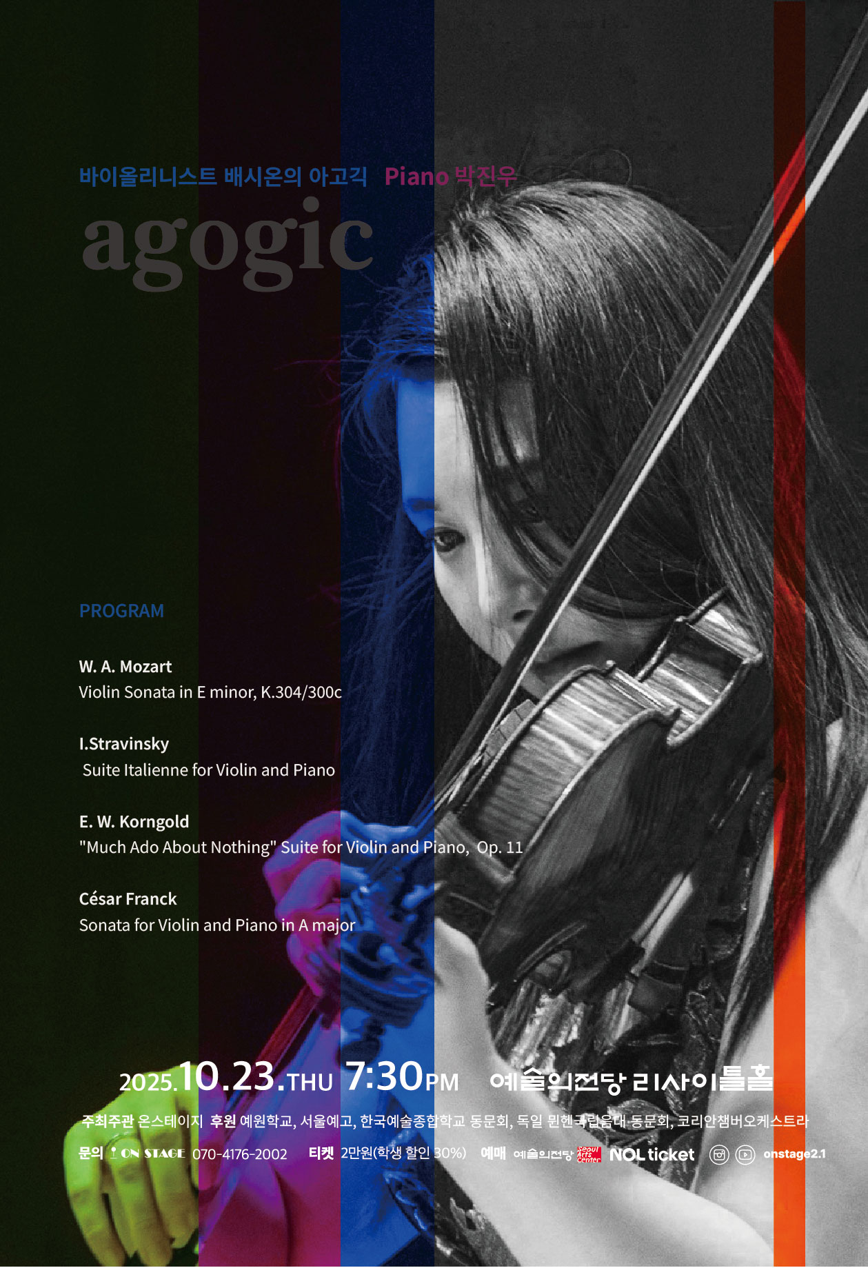 아고긱(Agogic)은 음악 연주에서 템포에 미묘한 변화를 붙여 다채롭고 풍부하게 표현하는 방법을 뜻한다. 우리 음악계의 중진 바이올리니스트 배시온은 바이올린이 표현할 수 있는 아고긱을 고전부터 현대에 이르는 도전적인 프로그램들을 통해 청중들에게 선사할 예정이다.