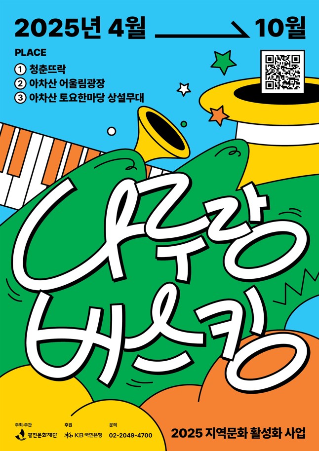 ‣ 사 업 명 : 2025 지역문화 활성화 사업 '나루랑 버스킹' ‣ 운영기간 : 2025. 9 ~ 2025. 10 ‣ 운영장소 : 청춘뜨락, 아차산 어울림광장, 아차산 토요한마당 상설무대 ‣ 협 업 : 건대프리마켓 ‣ 주최/주관 : (재)광진문화재단 ‣ 후 원 : KB국민은행 ‣ 문 의 : 02-2049-4700 |