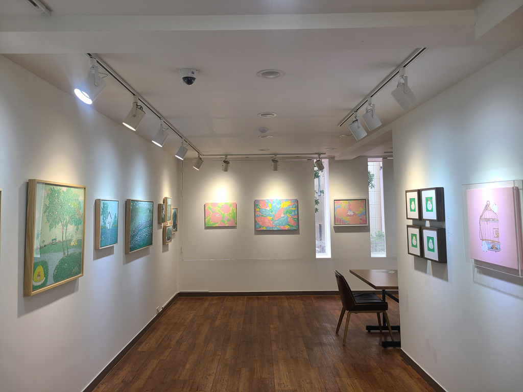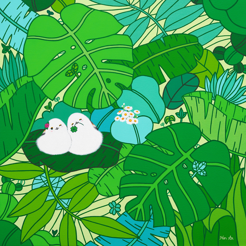 한아름 작가는 보호종인 흰머리 오목눈이 새와 열대 식물의 조화로운 구성으로 휴식과 위로를 전한다. 흰머리 오목눈이와 더불어 작품에 반복적으로 등장하는 식물 ‘몬스테라’는 아래쪽 잎에 햇빛을 가리지 않기 위해 스스로 찢어진 잎을 만든다.